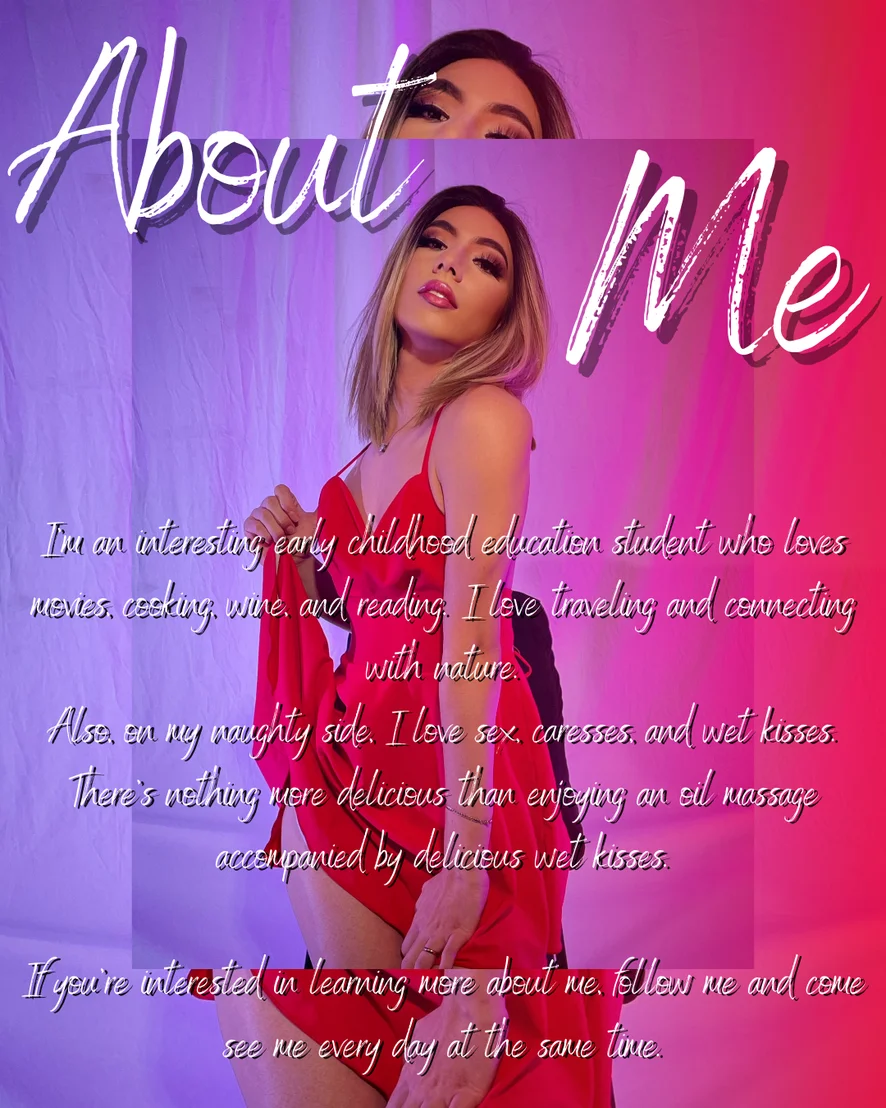 Also, on my naughty side, I love sex, caresses, and wet kisses. There's nothing more delicious than enjoying an oil massage accompanied by delicious wet kisses.